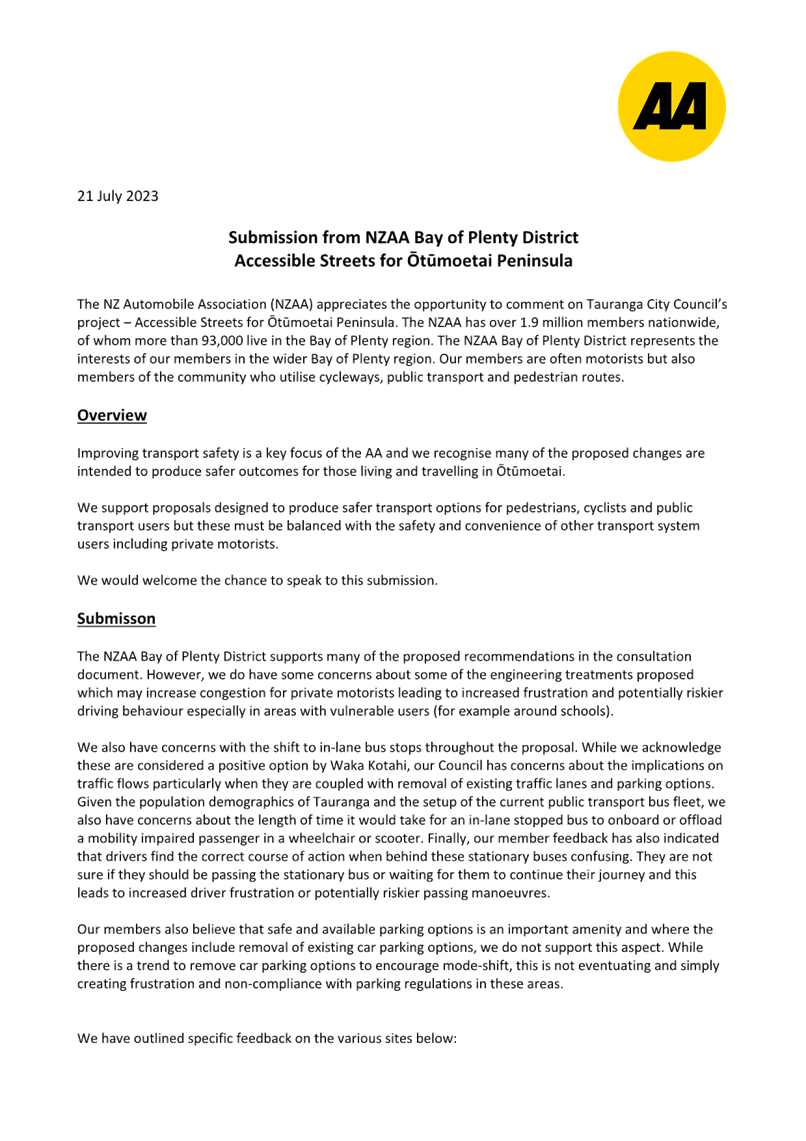 Attachment 11 Attachment K BOP AA Submission on Accesssible Streets Otumoetai 2023-07........................................................ 1908