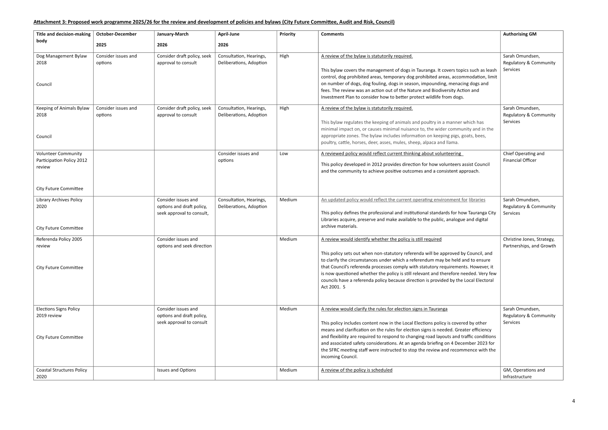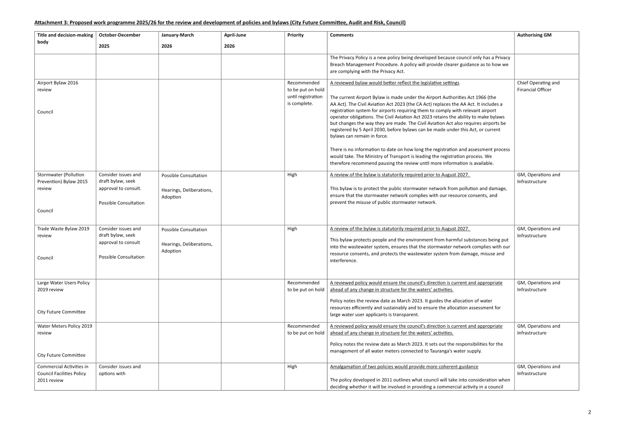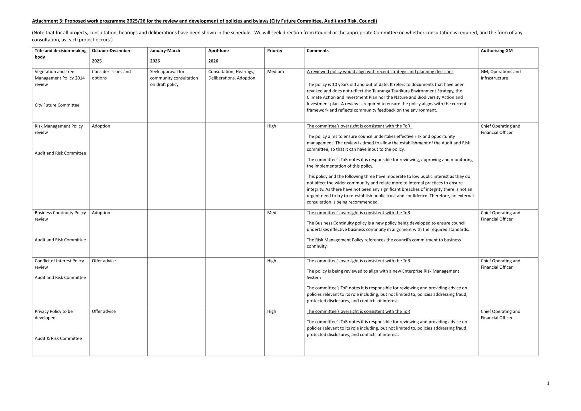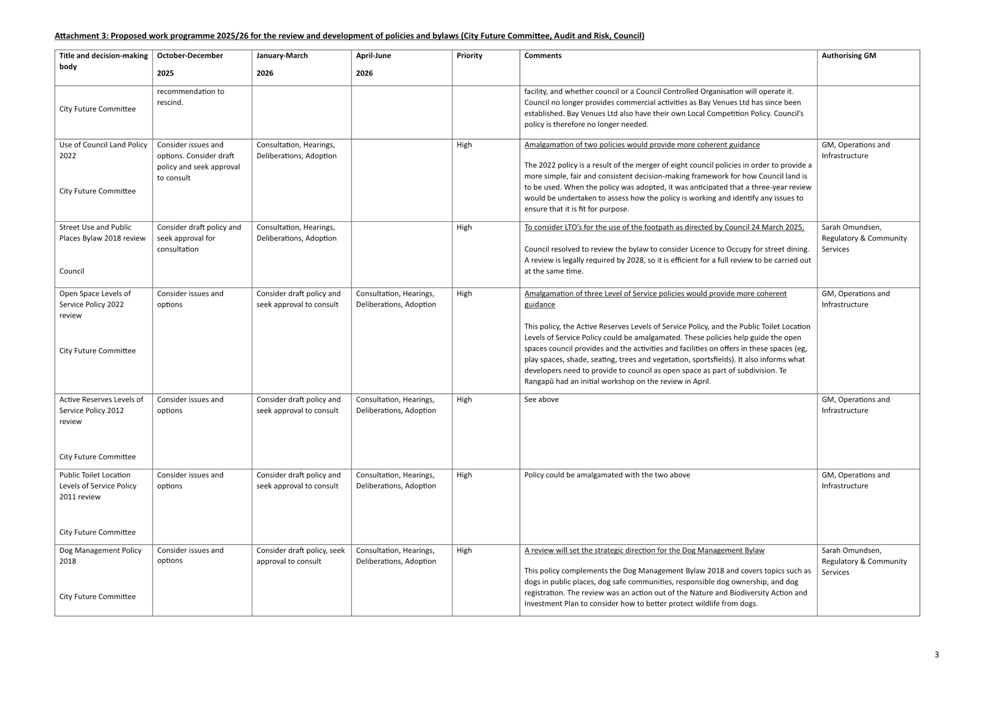 (c) Council’s policy programme (noting that some specific policies go to Audit & Risk and the full bylaw programme to Council). (Attachment B)