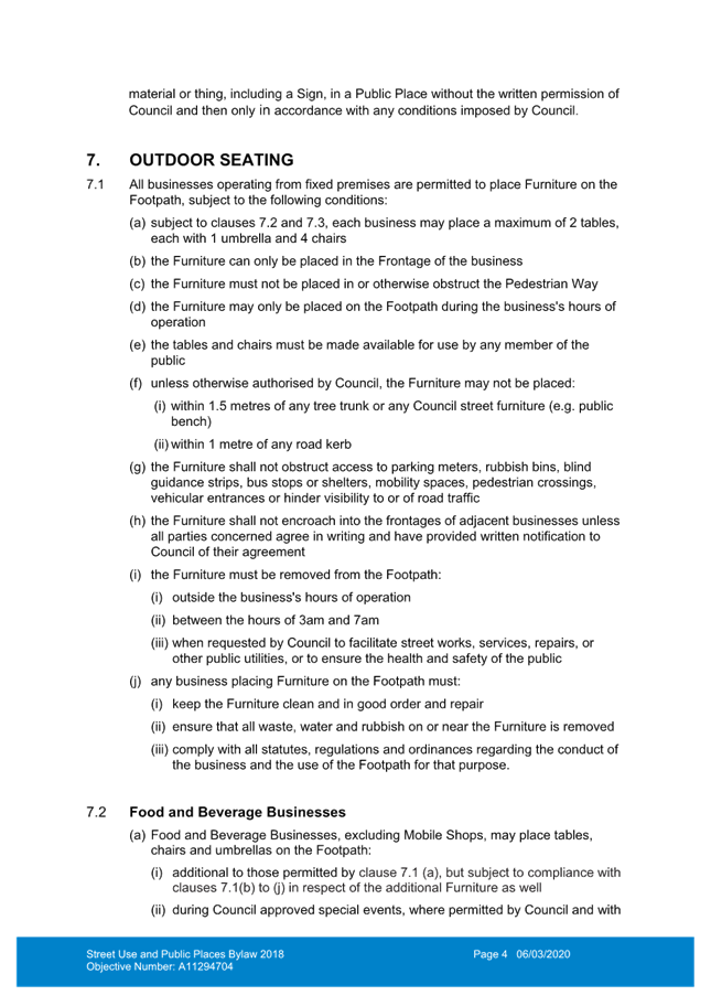 [5] All businesses operating from fixed premises are permitted to place a maximum of 2 tables each with 1 umbrella and 4 chairs on the footpath. Food and beverage businesses may place additional tables, chairs and umbrellas subject to conditions.