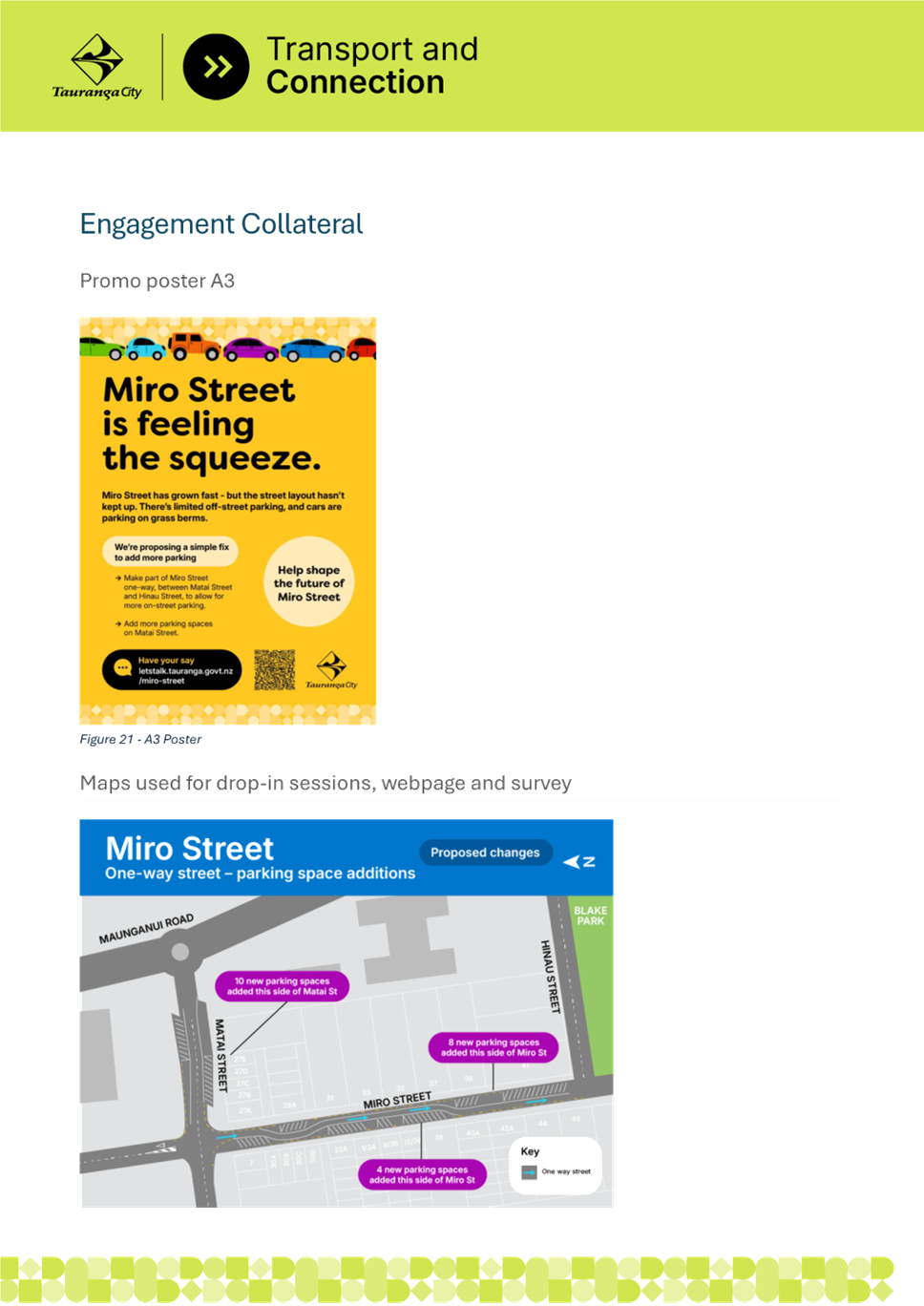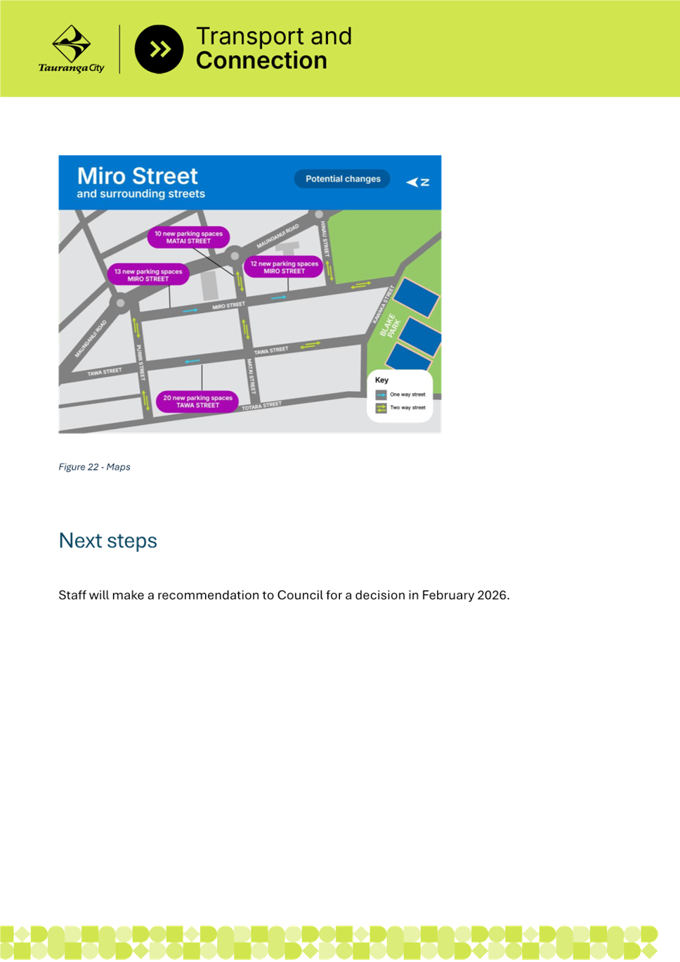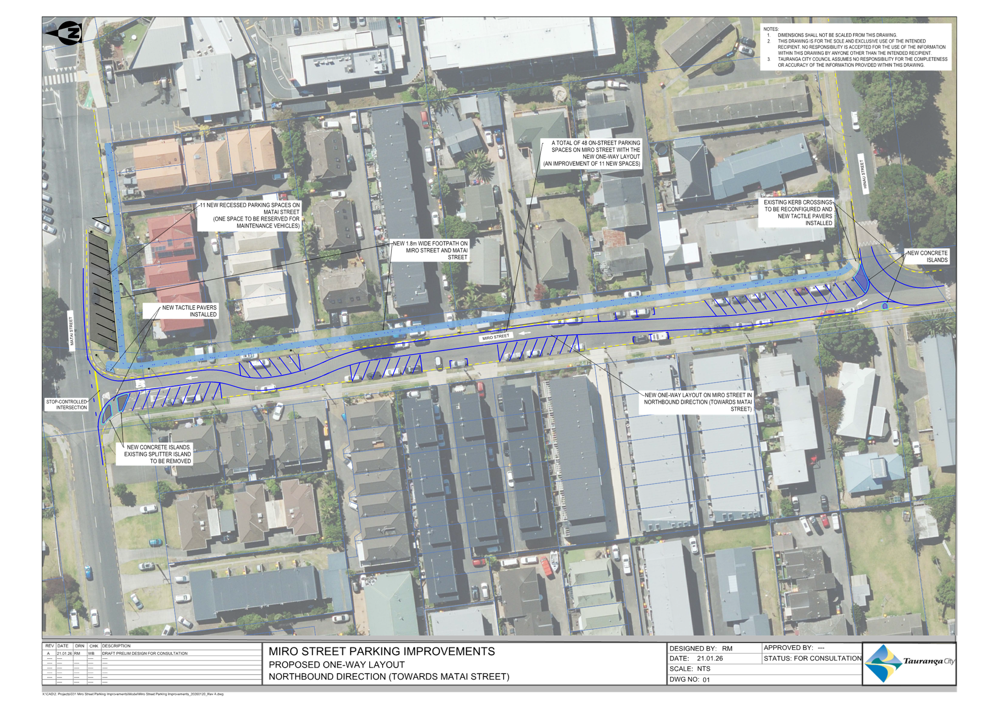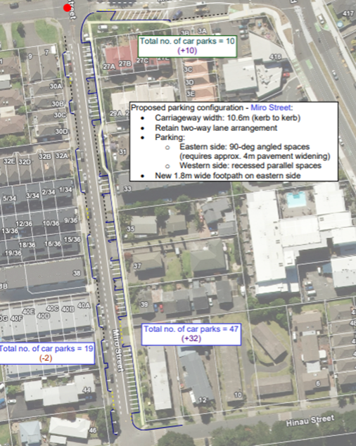 4. As a result, Tauranga City Council staff considered options to provide better parking for residents of Miro Street. It is believed the most cost-effective way to achieve this is by introducing a one-way traffic system on Miro Street between Matai Street and Hinau Street with angled car parking spaces.