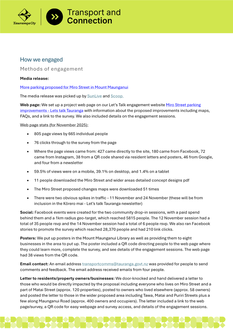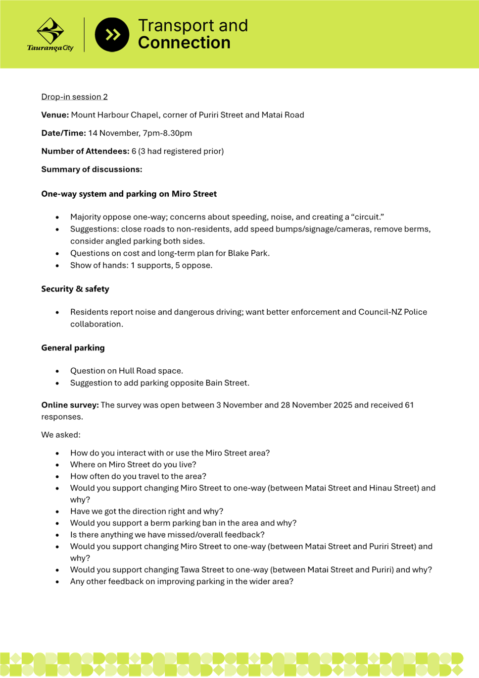 10. If approved, the intention would be to align the works with a March / April 2026 reseal of Miro Street to minimise cost and disturbance to residents.