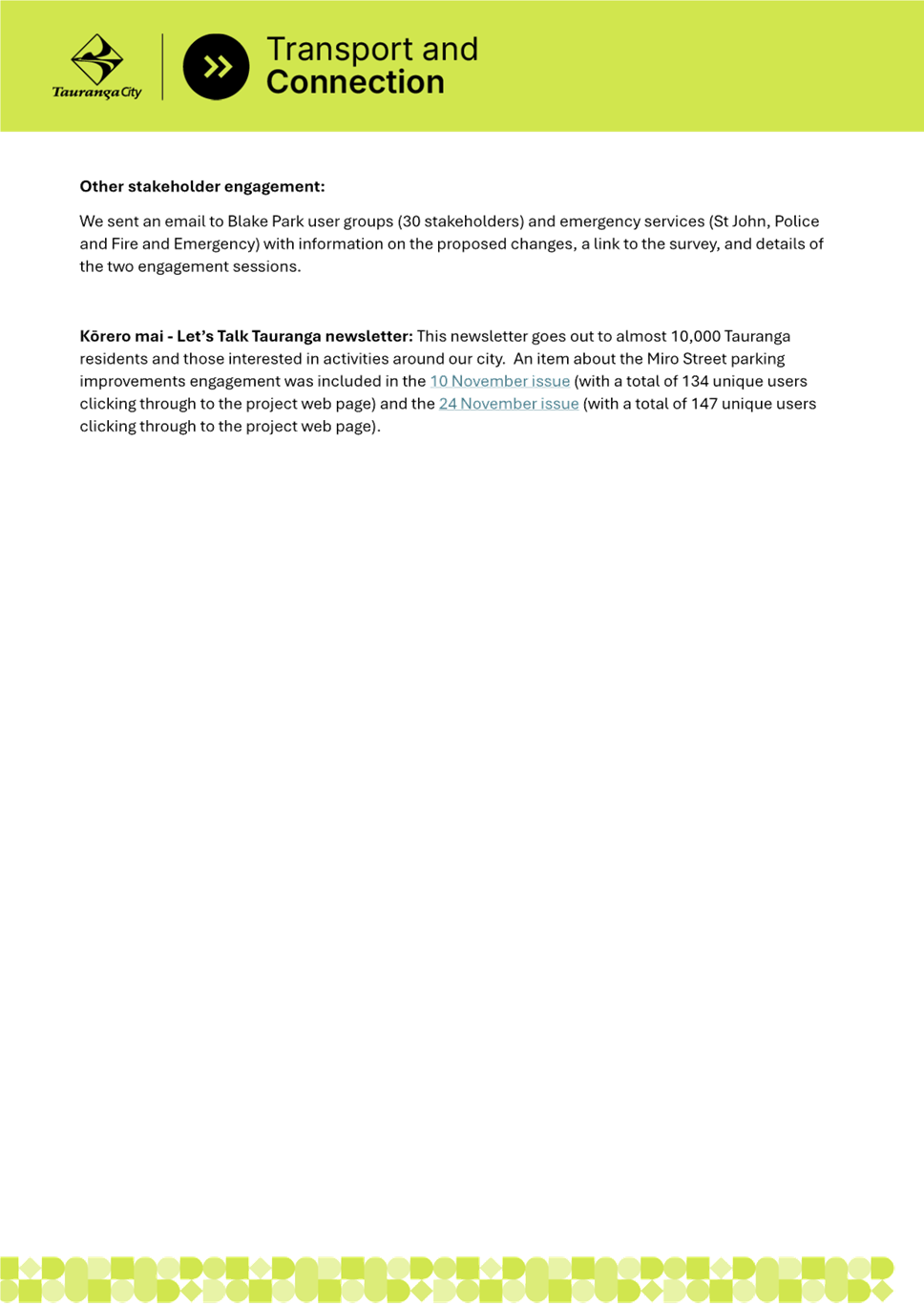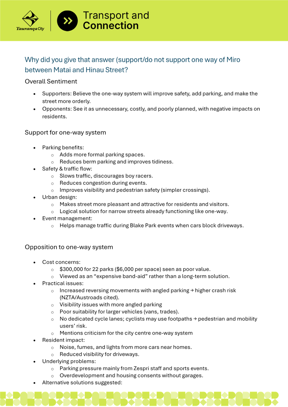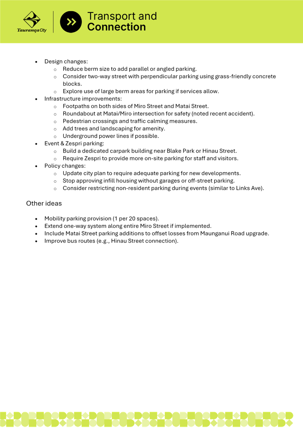 2. Miro Street is experiencing significant parking pressure due to residential intensification, nearby businesses, and Blake Park sporting facilities. The Miro Street community has notified council of the issues and requested improvements. Parking surveys undertaken by staff confirmed that parking demand exceeds capacity, particularly between Matai Street and Hinau Street, where berm parking is common and creates safety and amenity issues.