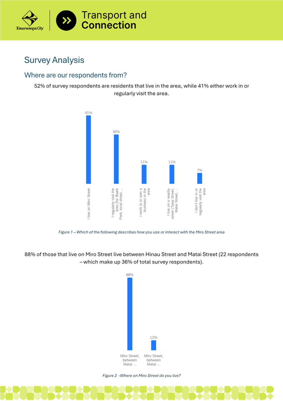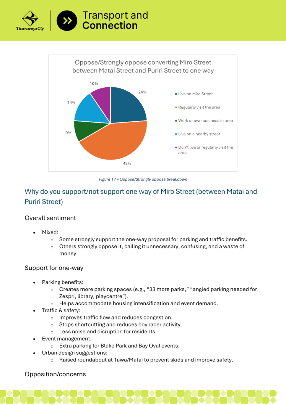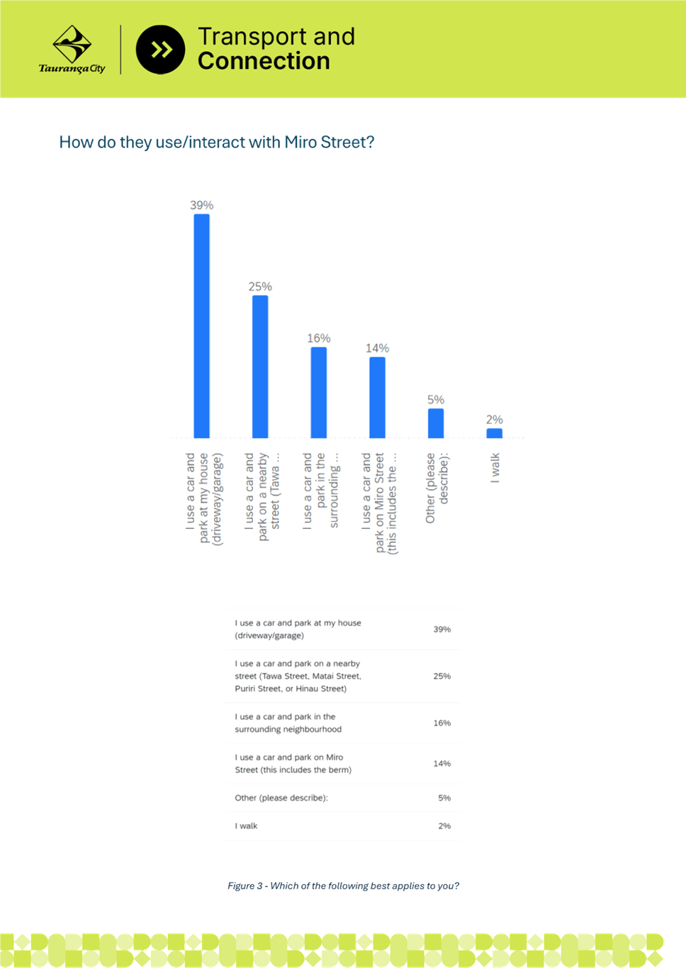2. Miro Street is experiencing significant parking pressure due to residential intensification, nearby businesses, and Blake Park sporting facilities. The Miro Street community has notified council of the issues and requested improvements. Parking surveys undertaken by staff confirmed that parking demand exceeds capacity, particularly between Matai Street and Hinau Street, where berm parking is common and creates safety and amenity issues.