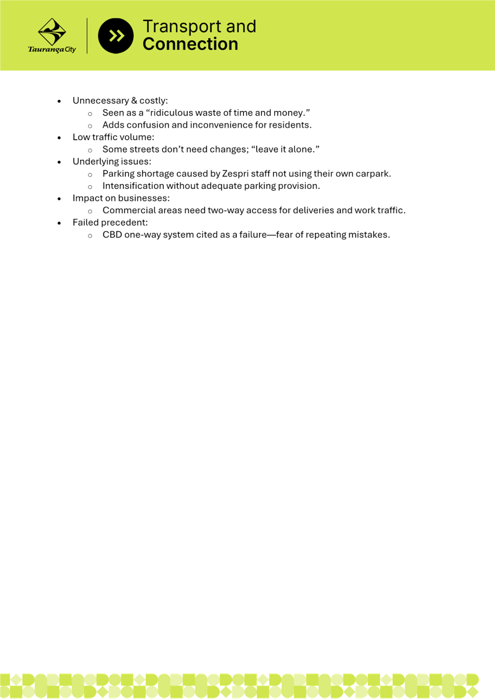 · Community perceives council as conducting not as good a practice consultation. · Less personal · May take time for regular submitters to get used to this new approach. |