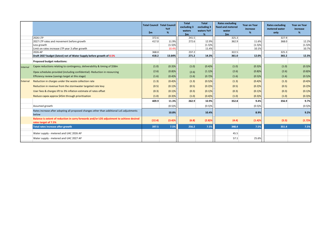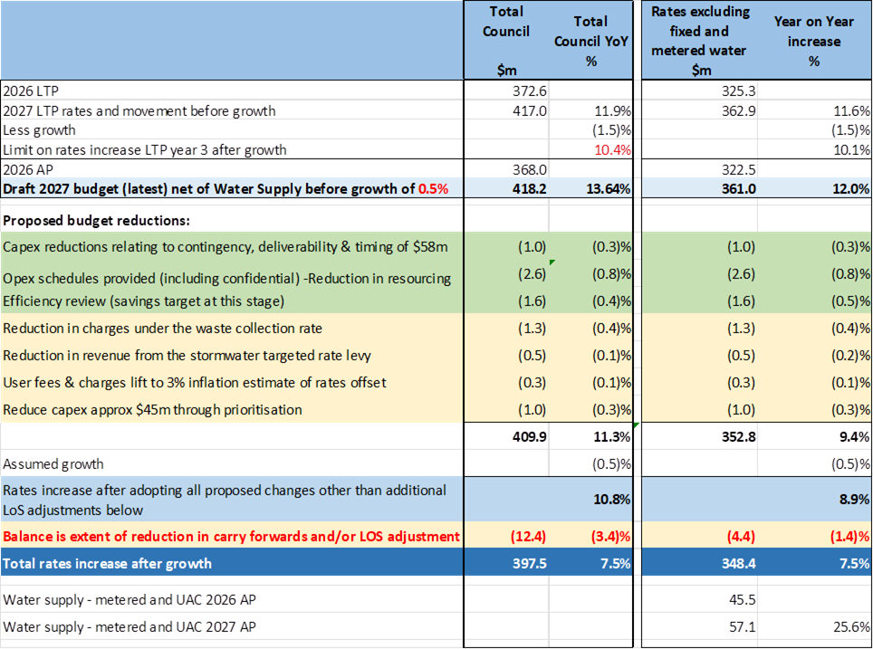 71. This report considers budget proposals that contribute to lowering rate requirement for 2026/27 to a target of 7.5% excluding revenue for water supply. Confirmation of budget changes will be applied to achieve a draft budget. It is noted that there is likely to be some variability in savings and rates impacts as details are incorporated in the corporate planning system.