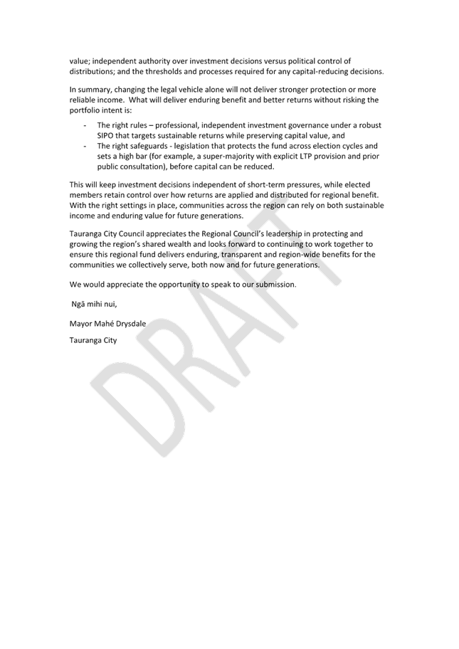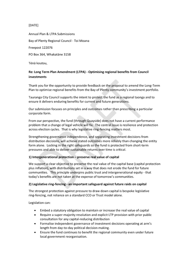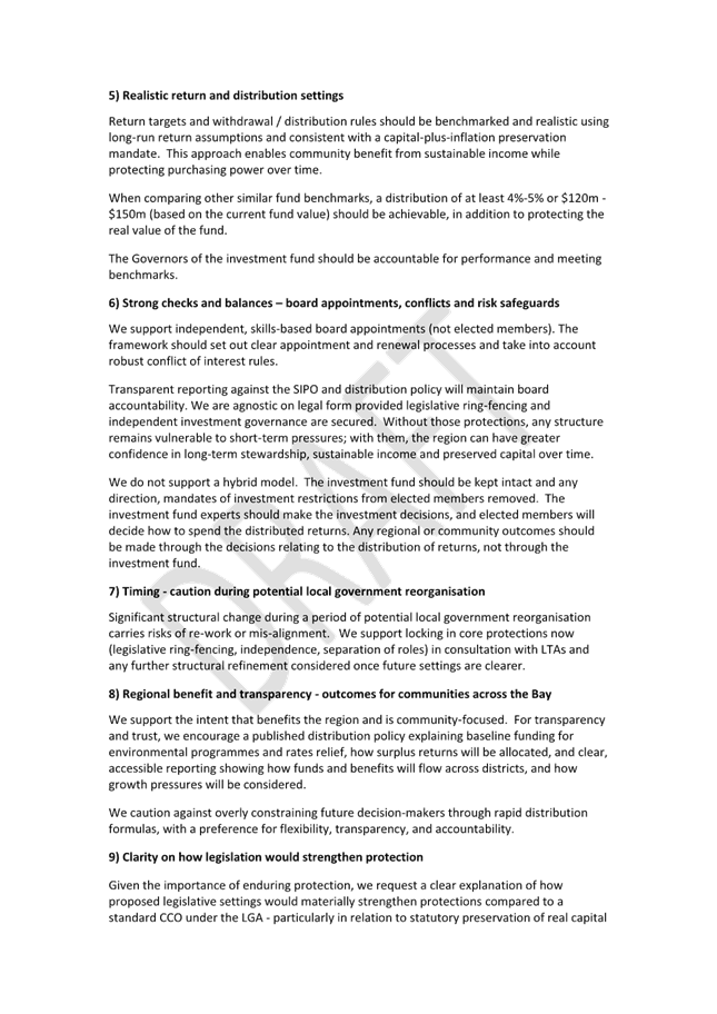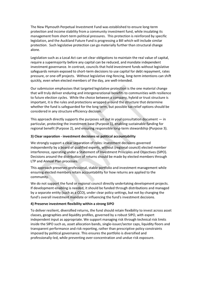 3. The attached draft submission focuses on principles relevant to the LTPA, including intergenerational protection of regional investment assets, the need for legislative safeguards, independent investment governance, and the clear separation of investment and distribution roles.